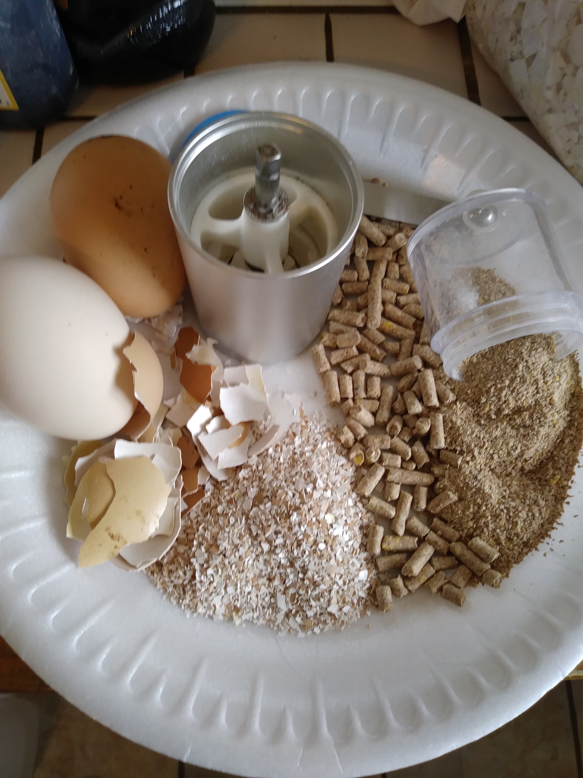 Collect eggshells while keeping poultry. These may be dried and baked for a short time on a cookie sheet in the oven. Bake at 140° for 30 minutes to kill the element that make the birds eat their own eggs.
